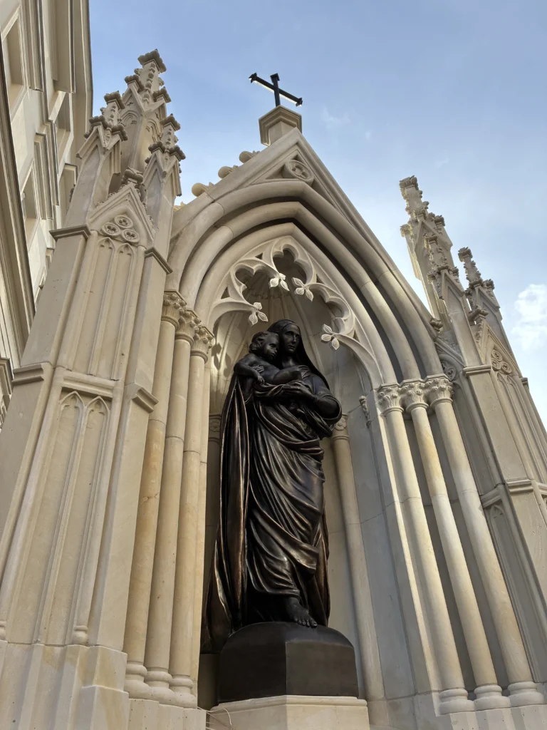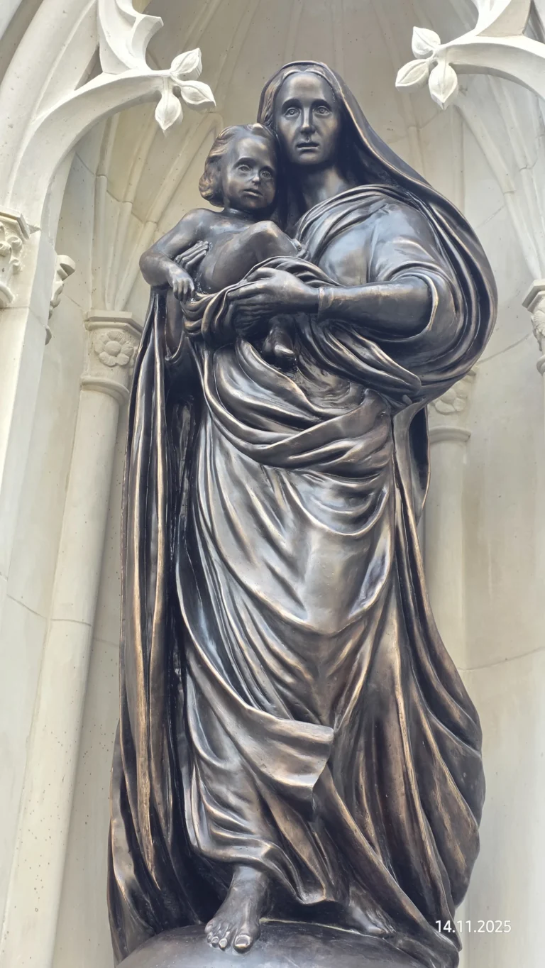 Figurę Madonny wyrzeźbił Marcin Sobczak, neogotycką kapliczkę odtworzył Marek Zielonka. Całość, według projektu Jacka Wilczaka i Stefana Bajera, zrealizowała firma Orlikon Sp. Z O.O