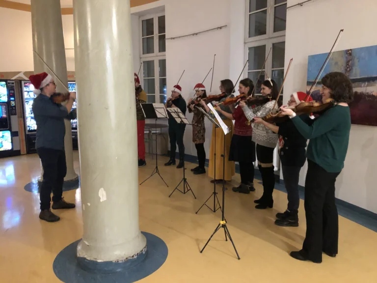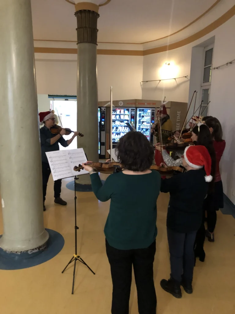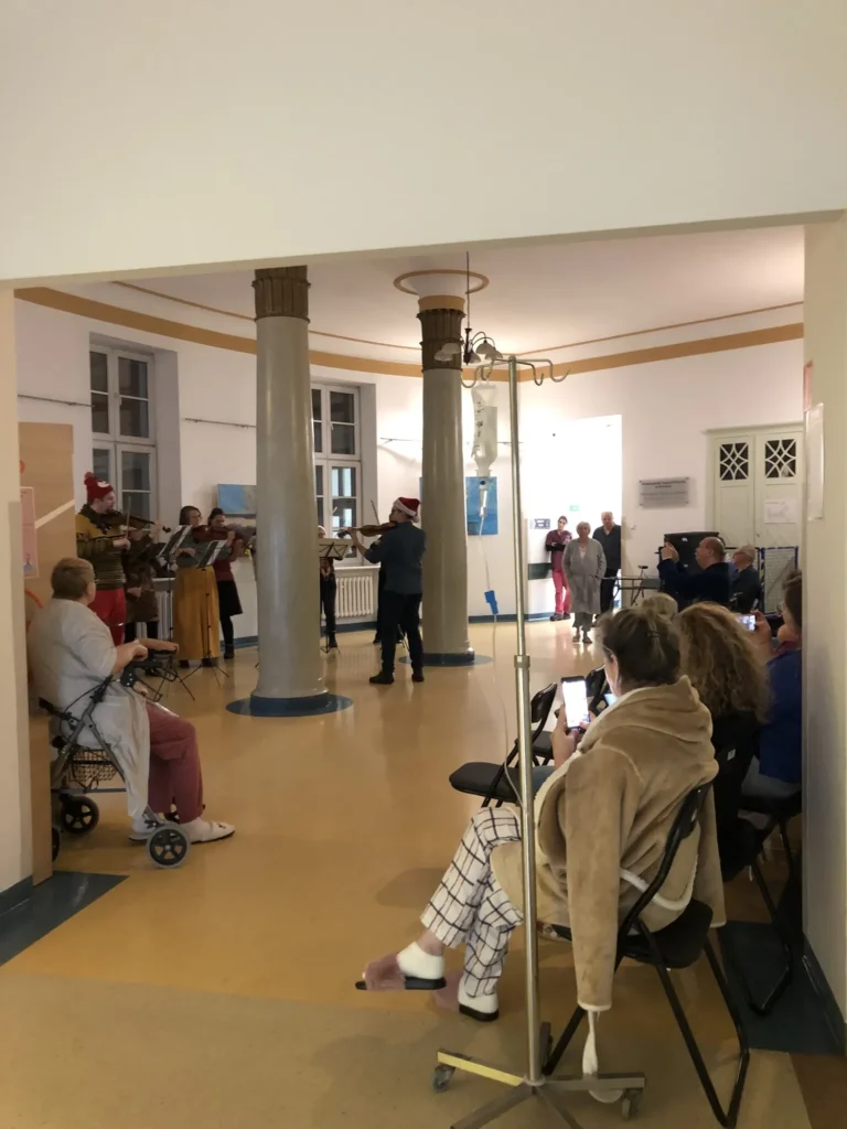 25.01.2024 r. mieliśmy niezwykłą przyjemność gościć w murach szpitala przy ul. Długiej ośmioosobową orkiestrę skrzypcową, która zechciała umilić pobyt naszym Pacjentom wykonując koncert kolęd w holu II piętra.
