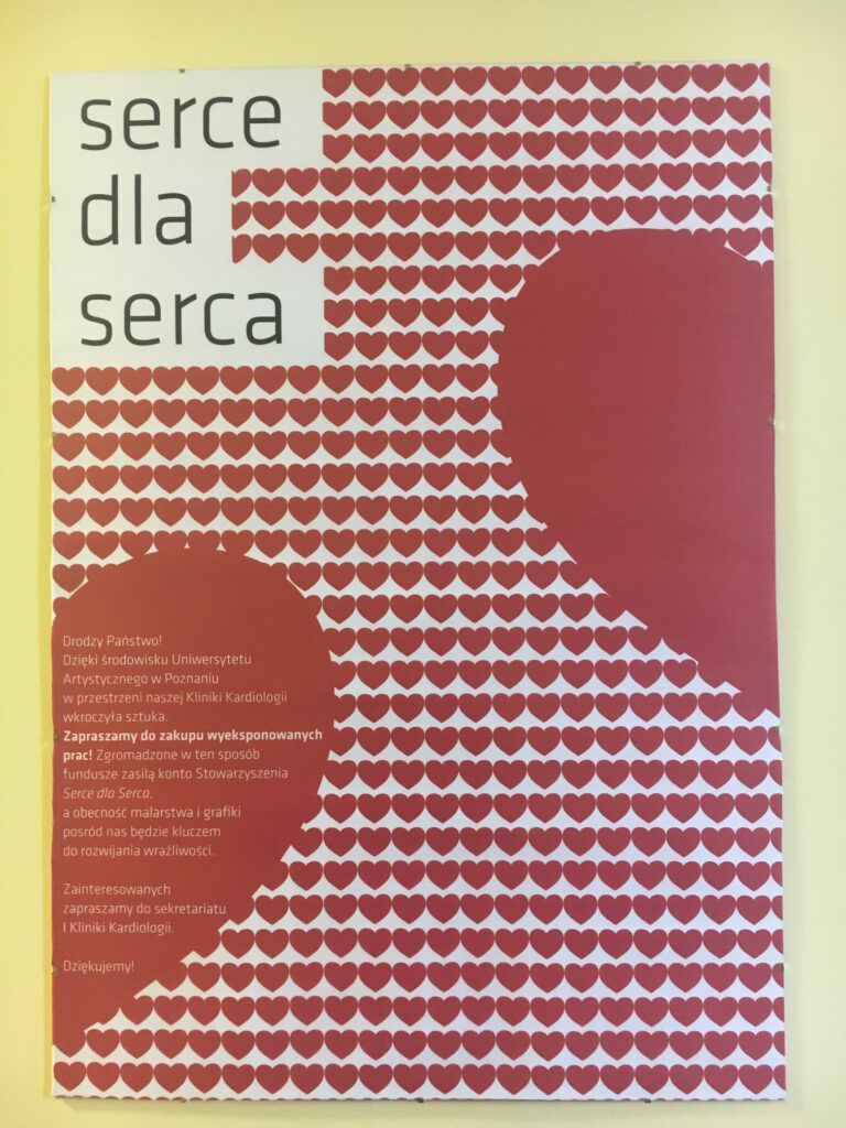 Hol drugiego piętra w budynku przy ul. Długiej to miejsce, w którym wspólnie z Uniwersytetem Artystycznym w Poznaniu wygospodarowaliśmy trochę przestrzeni dla sztuki. Pacjenci oraz odwiedzający mogą zobaczyć na ścianach Kliniki Kardiologii prace tworzące galerię Serce dla Serca.