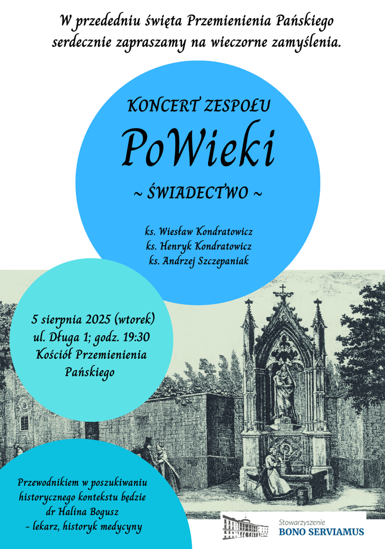 W dniu 5 sierpnia 2025 r. o godz. 19:30 w Kościele Przemienienia Pańskiego przy ul. Długiej 1 odbył się koncert Zespołu PoWieki: ~ŚWIADECTWO~ , zorganizowany przez Stowarzyszenie Bono Serviamus. Zespół PoWieki tworzą trzej księża: prałat Andrzej Szczepaniak, prałat Wiesław Kondratowicz oraz Henryk Kondratowicz – emerytowani proboszczowie parafii w Buku, Kowalewie i Górze, wyświęceni na kapłanów w 1974 roku przez arcybiskupa metropolitę poznańskiego Antoniego Baraniaka. Początki Zespołu sięgają jeszcze ich wspólnych czasów seminaryjnych – czyli okresu sprzed pół wieku. Wszyscy byli na tym samym roku w Arcybiskupim Seminarium Duchownym w Poznaniu i to właśnie tam zrodziła się ich myśl o wspólnym graniu. Od 50 lat tworzą wspólnie muzykę i na emeryturze aktywnie realizują swoją pasję koncertując i nagrywając teledyski.